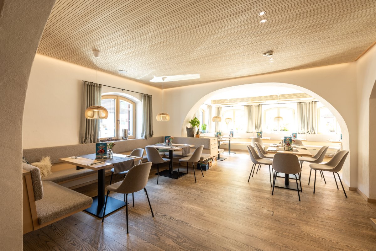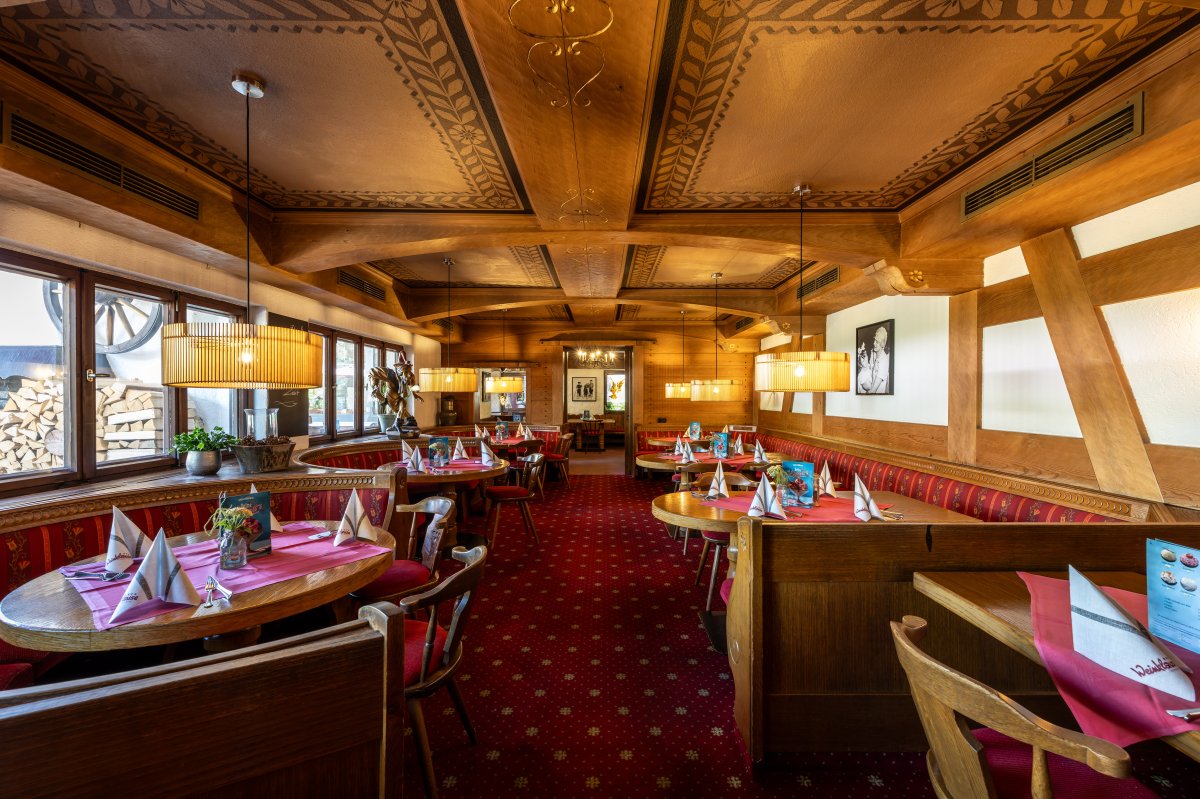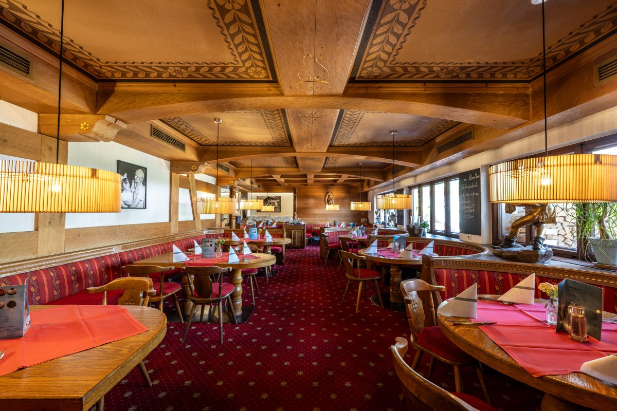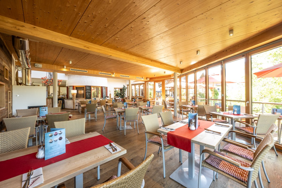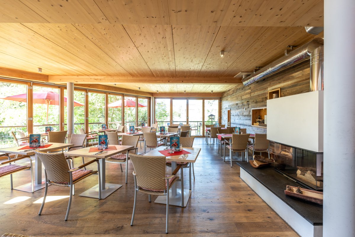 Mit dem großen Neubau 2013 ist auch der Wintergarten entstanden. Dieser Teil ist einer der beliebtesten Bereiche des Restaurants. Der Blick in den wilden Kräutergarten und den Himmelschrofen ist einzigartig.